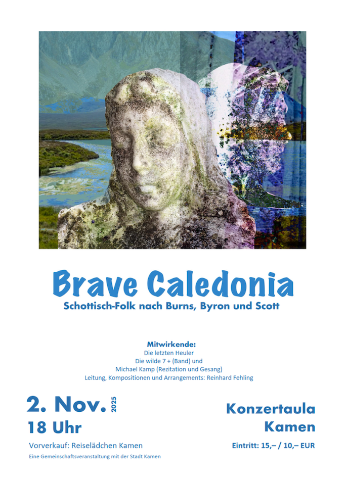 Im Kulturkalender der Stadt Kamen kommt er nicht vor: Der Chor ‚Die letzten Heuler‘. Das jedoch nicht deswegen, weil man ihn seitens der offiziellen Kultur schneidet, sondern weil der Chor das ganze Jahr über erst sein Programm entwickelt, das als Unikat regelmäßig zum Jahresende in der Konzertaula einem gespannten Publikum präsentiert wird. Am 2. November um 18 Uhr wird es so weit sein: Aus dem Arbeitstitel ‚KeltenWelten’ hat sich ein Programm gemausert, das nunmehr den Titel trägt ‚Brave Caledonia‘. Es enthält schottische Folkmusic, bestehend aus Traditionals, vor allem aber Songs nach Texten des literarischen Dreigestirns Robert Burns, George Gordon (auch genannt ‚Lord‘) Byron und Walter Scott. Chorleiter und Komponist Reinhard Fehling hat Originalmelodien und eigene Kompositionen verwoben und ein Gesamtbild geschaffen, das viel über schottische Emotionen, Naturempfindungen, aber auch historische Entwicklungen erzählt.